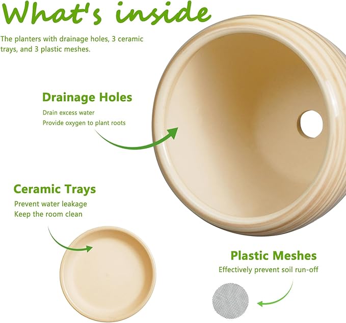 - Drainage Holes and Accessories: Each ceramic plant pot has a drainage hole at the bottom, a mesh, and a ceramic tray for collecting water. This will provide ample oxygen to the plants
