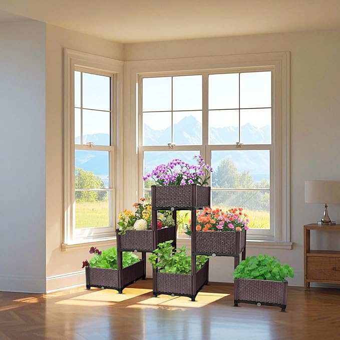 - Durable Structure: Made of reinforced plastic in rattan style, it’s lightweight yet sturdy for long-term use indoors or outdoors. The triangular setup gives the elevated garden bed great stability.