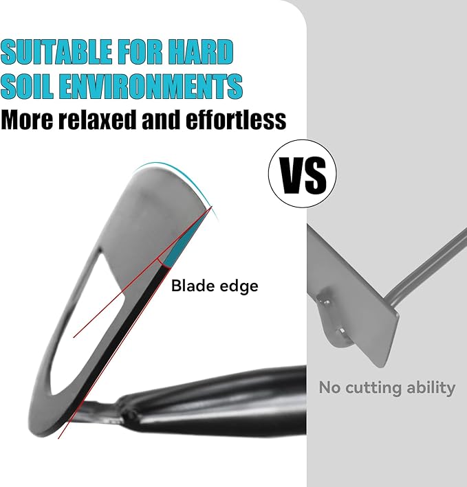 - Integrated Structure:Compared to disassembly and assembly,the integrated full-size tool has higher strength and better durability,and can cope with various complex environments without worrying about excessive hand force causing the handle to break.The hoe blade is made of high-strength metal with sharp edges,so there is no need to worry about the soil being too hard for the blade to fit in.