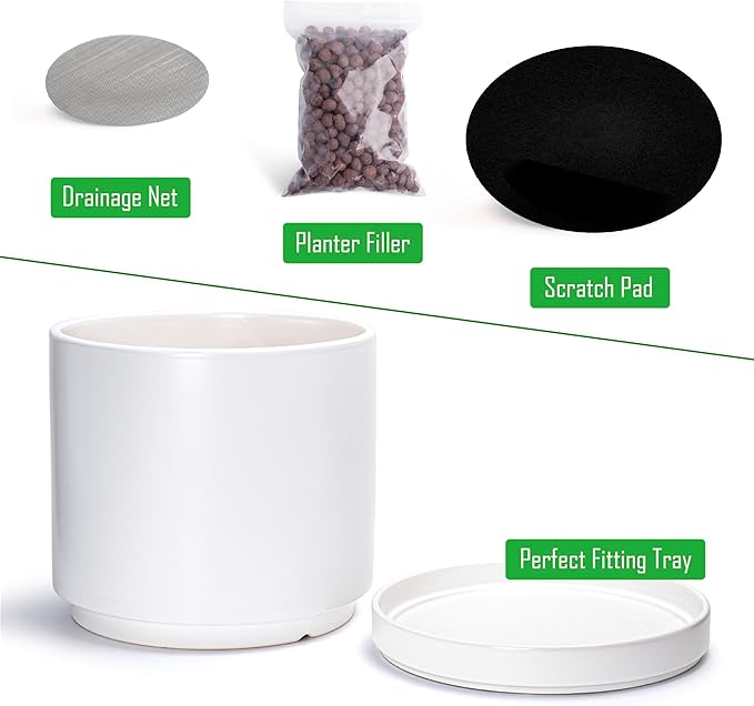 - Simple, elegant, and modern cylindrical straight round planter pot with saucer and drainage hole.