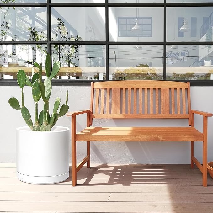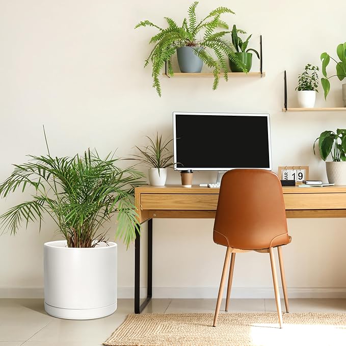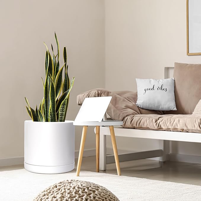 D'vine Dev 14 Inch Ceramic Planter Pot with Drainage Hole and Saucer, Indoor Cylinder Round Planter Pot, White, 94-O-G-1