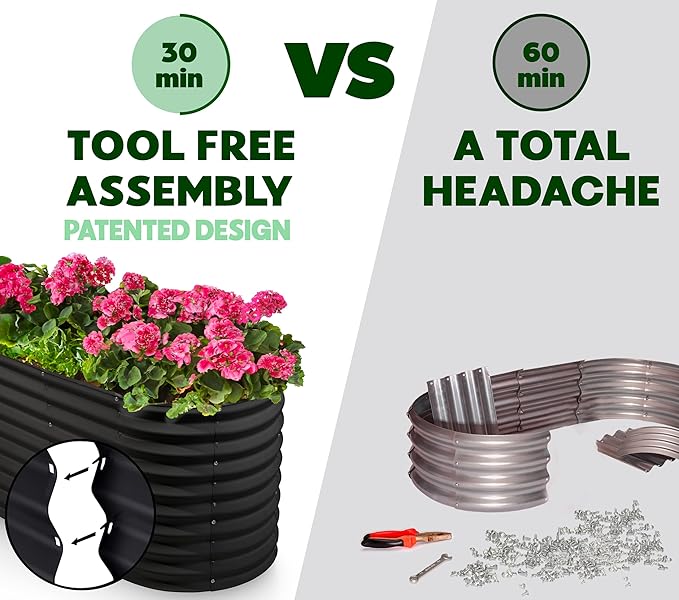 - EFFORTLESS ASSEMBLY, LIKE NO OTHER! Begin your planting journey by choosing our innovative patented design, featuring the perfect combination of easy assembly and durability. Thanks to our unique tool-free design, assembly is a breeze and can be completed in just 30 minutes! Get started on your garden right away and enjoy fresh, healthy produce in no time.