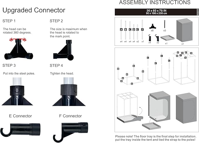- Upgrade Design --- UPGRADED CONNECTOR--Durable PA Material Adopted, Anti-rust Reinforced Design, Adjustable Tightness According to The Pole, Hold Poles Tightly for Firmed Support. Multiple vents to accommodate fans and filter; ducting rectangle window with mesh to keep dust and insects out; Removable mylar floor tray easy to clean.