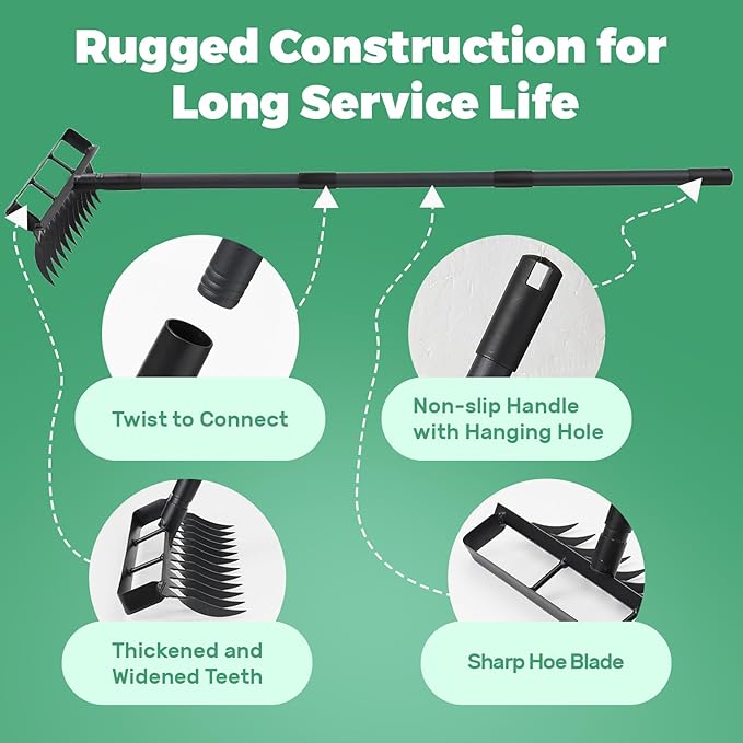 - Versatile Garden Tool: The Weed Puller features a 2-in-1 design with a Hula Garden Hoe and a 12 Tines Rake, making it an essential garden tool for efficient weeding and soil cultivation.