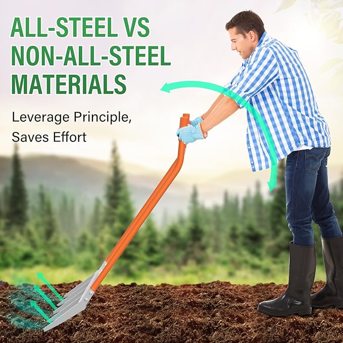 - High Quality Material and Thickened Design: This broadfork is made of all-steel and thickened premium material with an added galvanized layer that prevents rust and corrosion,durable,won't rot or break like wood,and able to challenge tough tasks and challenging soil conditions