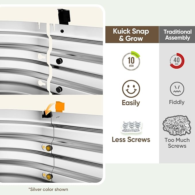 - 【Kuick Snap & Grow】Tired of spending hours bending over to assemble a raised garden bed? Our patented Snap-Lock technology eliminates 75% of screws, allowing you to easily interlock the metal panels like building blocks, so you can assemble it quickly during a coffee break.