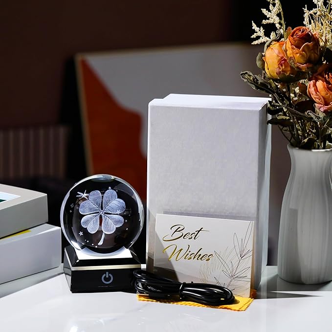 Qianwei 3D Four Leaf Clover 80mm Crystal Ball Good Luck Gifts Ideas with Multicolor Lighting Base - Irish Gifts for Women Decor 4 Leaf Clover