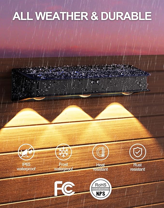 - 【9 Colors & 3 Modes】There are 3 lighting modes in this outdoor solar step lights, that is FIXED COLOR, GRADIENT and JUMP. In FIXED COLOR, you will have 9-color options concluding cool white, red, green, blue, yellow, cyan, ice blue, purple pink and warm white. The others are the automatic gradient changes and jump change of these 9 colors. You will only need to press the button at the bottom to adjust the lighting modes.