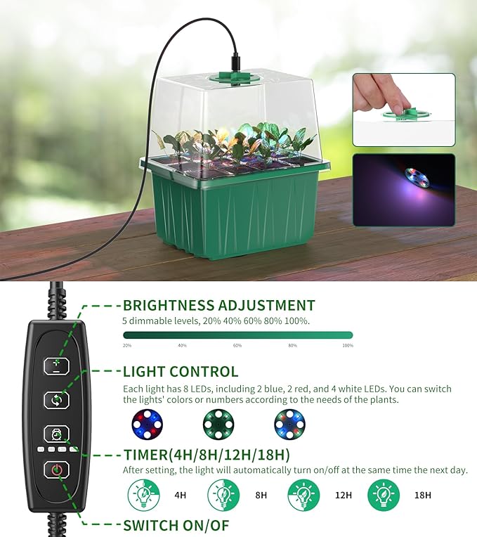 - 【Built-In LED Grow Lights for Optimal Growth】The integrated LED grow lights of this seed starting trays mimic natural sunlight, promoting vigorous growth. With adjustable brightness and timer settings, you can tailor the lighting to suit the stage of your seedlings' growth. Grow fresh basil, juicy tomatoes, or stunning flowers right from the comfort of your home—rain or shine.