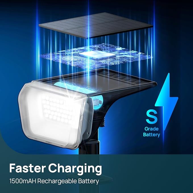 - Dusk to Dawn Landscape Lights & Solar Charging Lights: The solar spotlights is equipped with a 1500 mah powerful battery with an energy conversion efficiency of up to 30%, which is effectively charged in sunlight. It charges during the day and lights up automatically at night. For best results, charge 48 hours before first use.