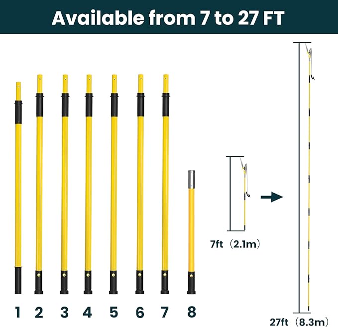 - 【Multifunctional Pruning Tool】With our brand new pole saw, pruning has never been easier! Different heights can be selected by splicing 8 pole saws, from 7.3 feet to 27 feet (2.24 m to 8.24 m), avoiding the danger of climbing altogether. Designed for pruning high branches, it can also be used as a handheld saw to trim low bushes and logs, instantly giving you a neat and perfect yard.