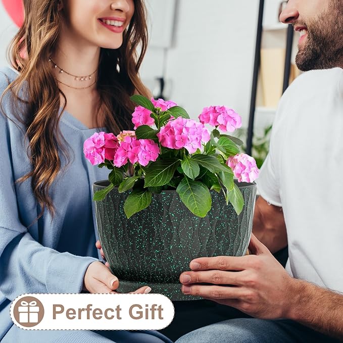 12 Inch Wide Water Ripples Flower Pots for Indoor or Outdoor Plants, Large Plant Pots with Drainage Holes & Saucer, Plastic Planters Set for Garden & Home Decor (Black with Green Speckles)