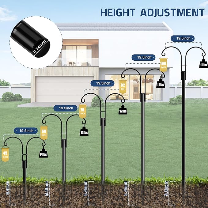 - Versatile & Multi-Purpose: Built with a sturdy frame and double-arm design, our outdoor shepherd's hook is ideal for hanging solar lanterns, flower baskets, plant pots, hummingbird feeders, wind chimes, and more. As shepherds hooks for outdoor, it adds charm and functionality to any outdoor space, making it the perfect accessory for gardens, patios, or backyards.