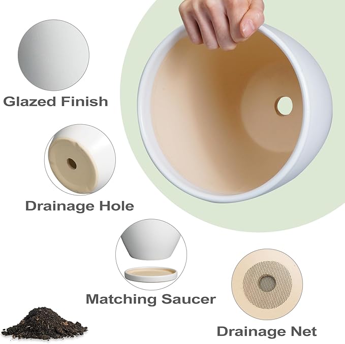 - Plant Pots with Drainage Holes and Saucers: The drainage holes can effectively remove excess water from the ceramic planter to avoid root rot; while the ceramic plant saucer can catch excess water seeping out from the bottom of the ceramic flower pot to keep the home environment tidy
