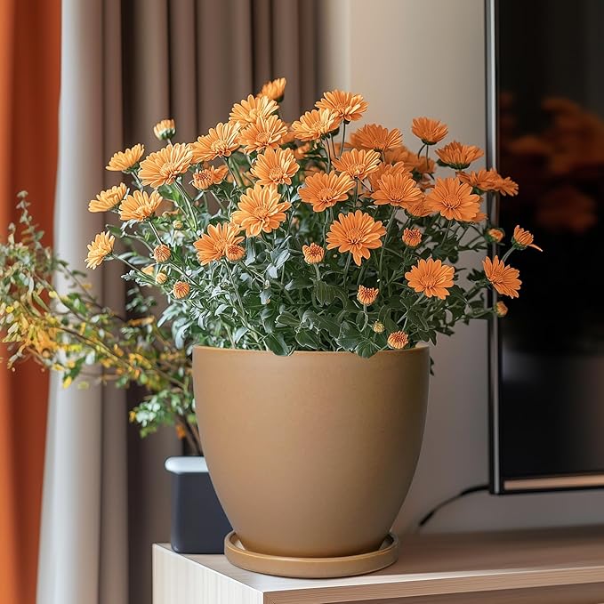 Ceramic Pots for Plants - 8 Inch Planter, Indoor Plant Pot with Drainage Hole and Saucers, Modern Flower Planter, Home Garden Patio Bathroom Porch Room Decor, Brown