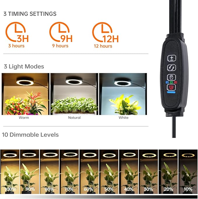 - Convenient Timer Function - Easily set the grow lights to automatically turn on and off at scheduled times (3/9/12 hours). This feature ensures your plants are well-cared for, even when you're busy or away