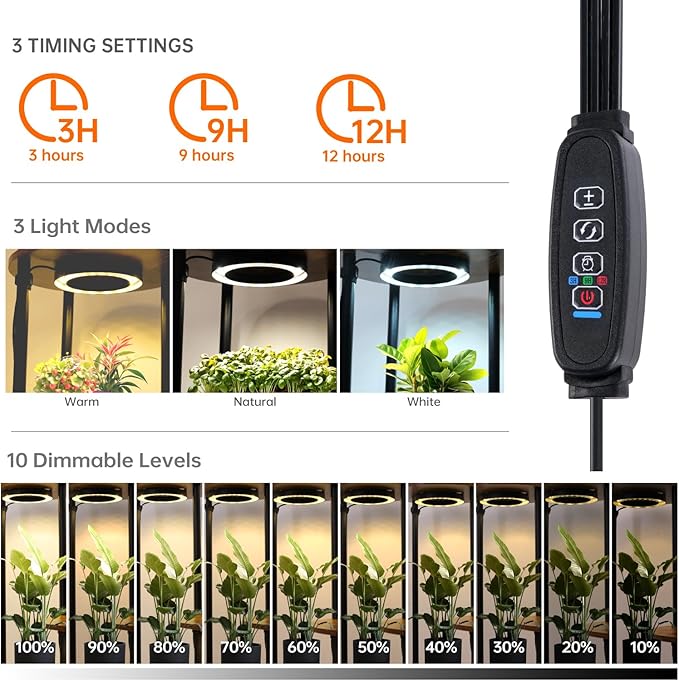 - Convenient Timer Function - Easily set the grow lights to automatically turn on and off at scheduled times (3/9/12 hours). This feature ensures your plants are well-cared for, even when you're busy or away