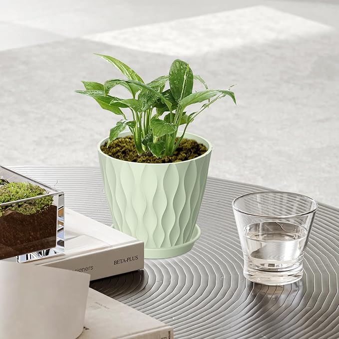 6 Pack 4 Inch Small Plant Pots with Saucers, 3D Textured Plastic Planters with Drainage Holes for Indoor and Outdoor Plants, Flowers, Herbs, Succulents, and Seedlings, Green