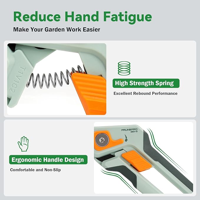 - 【Ultra Sharp Blades】Our blades, crafted from 1.4116 German stainless steel and coated with "Diamond" Teflon technology, provide low friction and high wear resistance. This enhances sharpness of our garden scissors, making every cut easy and smooth. PrunePro garden shears ensure a clean, flat cut on branches without crushing or damaging your plants
