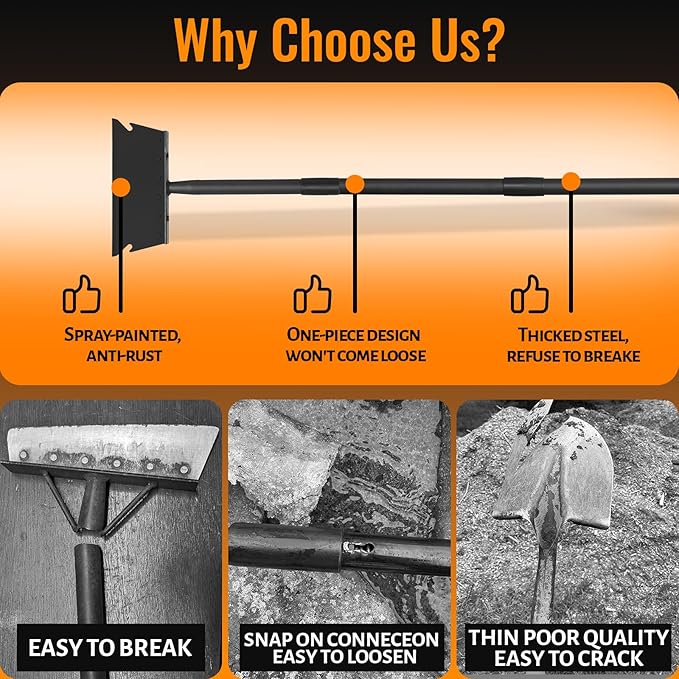 - Efficient Working: Equipped with a razor-sharp cleaning shovel head made of highly wear-resistant, thickened manganese steel saw blades, our garden shovel guarantees unrivaled digging performance. This specially treated material ensures the durability of the shovel, providing you with superior digging results. The sharp edges of the shovel make digging,weeding, removing snow, and scraping ice effortless.
