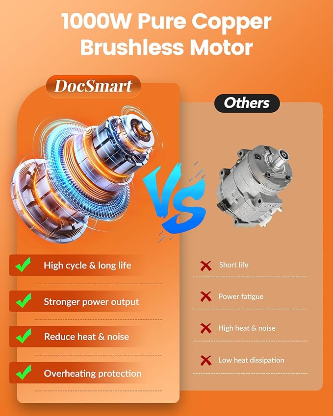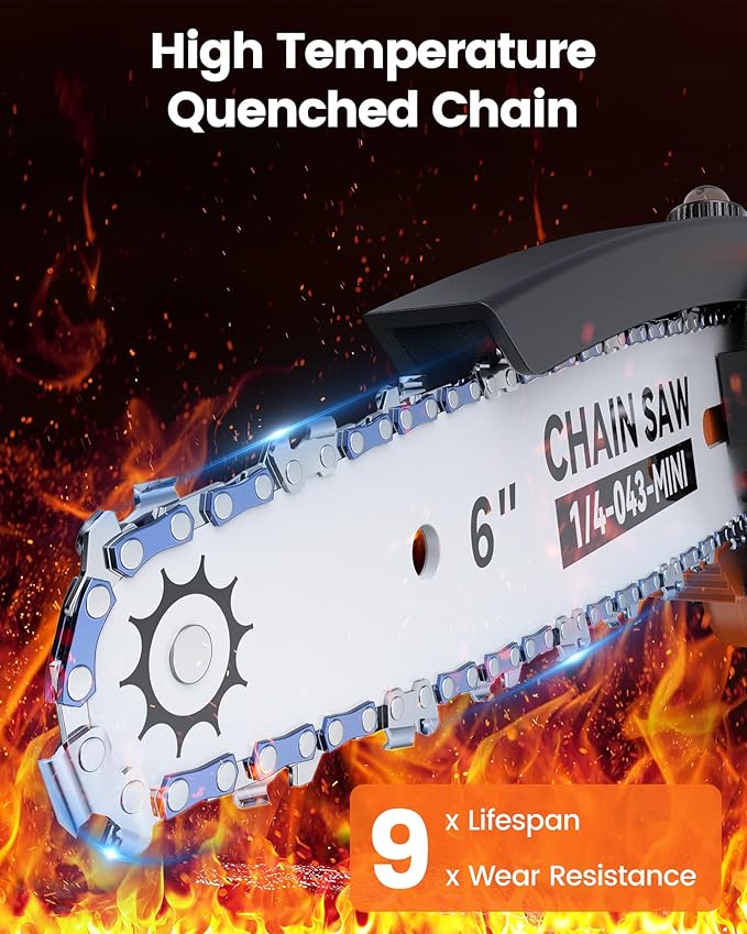 - High-Performance Motor: A 1000W pure copper motor drives the mini chainsaw at 26ft/s and delivers faster and more efficient cuts, cutting 6-inch branches in 8s with no effort(actual time may vary depending on the size and hardness of the wood). Thanks to the deep quenching process, it ensures smooth cutting