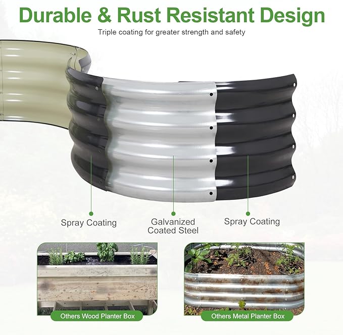 - 【Upgrade Quality & Structure 】The raised garden bed is made of thick galvanized metal with a surface spray coating, which is rust proof and anti-corrosion. Can be used for a long time. The Round design ensures uniform surface force and prevents deformation. More durable than other raised planter box, becoming a good helper for your garden