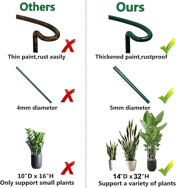 - 【Invisible Strong Wire】Garden support stakes are made of green plastic-coated steel, weather-resistant, reusable and long-lasting, better than those wood support. Dark green color blends into plants, seems invisible. Built thicker 5mm plant stake metal and stronger iron wire in 5mm to hold up heavy large plants.