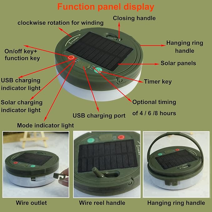 - ⭐【Timer Function and Swivel Base】Retractable camping string lights can be set the auto timer for 4/6/8 Hours by the time switch key. Swith light and light mode button can adjust the brightness and change to the 10 lighting modes like steady on, breathing blinking, SOS flashing, etc. The swivel base of the light helps you to quickly put away the light string, and our solar string lights is sturdy and durable, can be bent and twisted at will and not easy to tear.