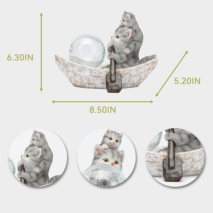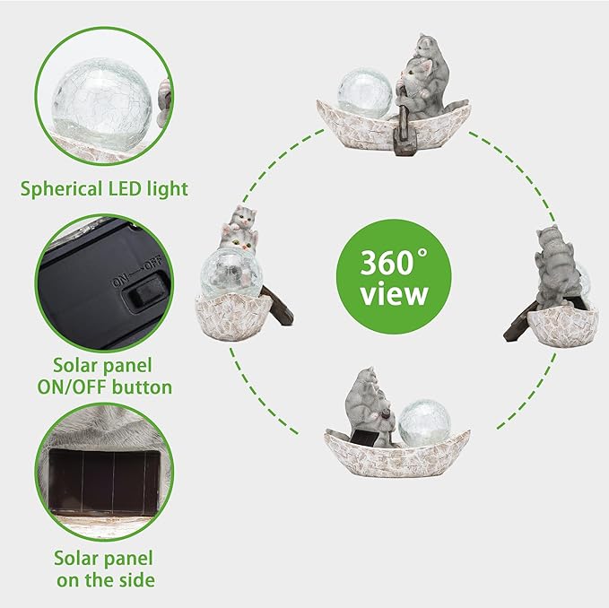 - 【Easy To Use】The patio Cat ornament which just toggle the bottom switchand leave it in the "on" position in the daytime.The solar Cat sculpture charge during the day and light up automatically at night.If the led lights don't turn on when you receive it that maybe caused by the long time shipping.Just place Cat in the sunlight for a few hours,and the problem will be fixed.