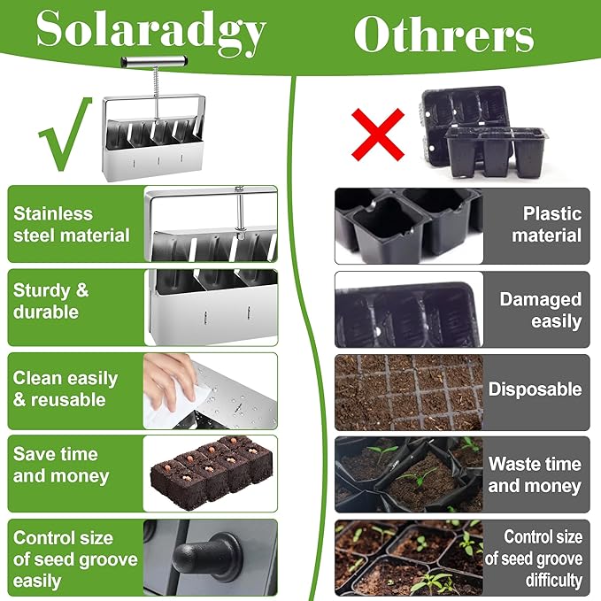 - 【𝐄𝐟𝐟𝐢𝐜𝐢𝐞𝐧𝐭 𝐒𝐨𝐢𝐥 𝐁𝐥𝐨𝐜𝐤 𝐌𝐚𝐤𝐢𝐧𝐠 𝐊𝐢𝐭】Soil blocker includes a stainless steel soil block maker, a seed pin and a scraper, help to quickly and easily make uniform soil blocks, improve seed germination rate and avoid transplanting stress. It is an ideal choice for gardening enthusiasts