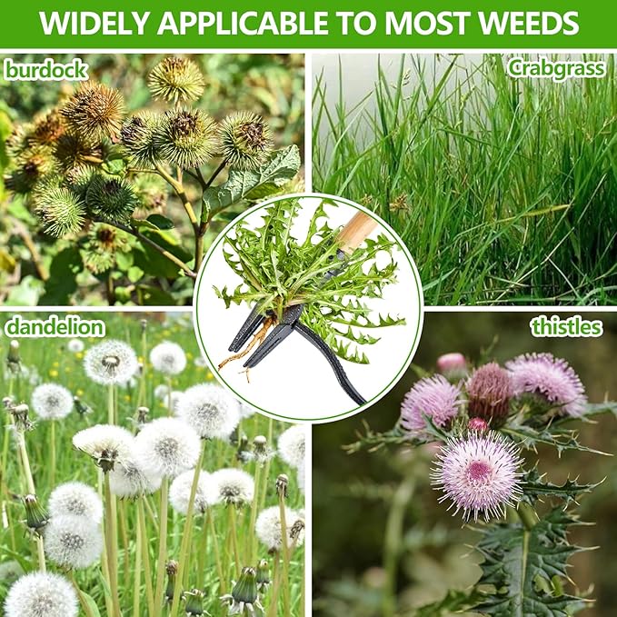 - 【Widely Used】This weeder is widely applicable to various invasive weeds in gardens,including dandelions, crabgrass, thistle, quack grass, plantain, clover, burdock, and other weeds. Please note that it may not perform as well on hard clay or rocky surfaces.