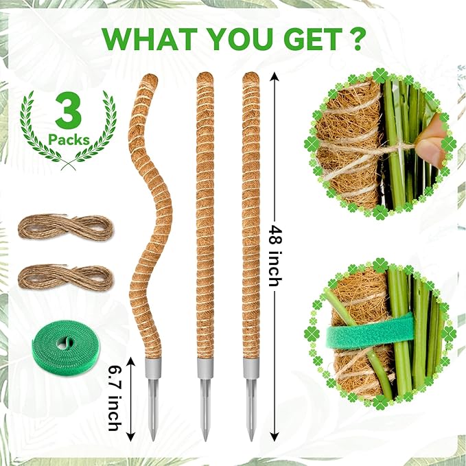 - Sturdy Moss Poles for Indoor Plants: Expertly crafted for durability and functionality, our 3-pack of 48-inch moss poles offers reliable support for a variety of climbing plants, including monstera, philodendron, and pothos. Featuring a flexible design and an easy setup process, these plant supports are perfect for both beginners and experienced gardeners