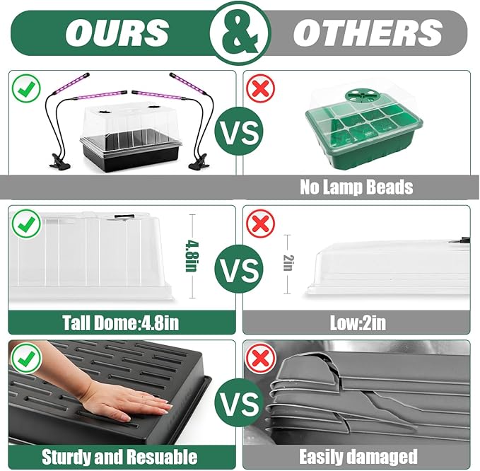- 【Sturdy and Reusable Kits】Our seed starting kit are made of thicker, higher quality material. These trays are deep and sturdy. The lids are tall and click on so they don't blow off in a breeze. Seed germination rays and domes are thoughtfully designed with touches like the transparent controllable vents that should make seedlings and cuttings very comfortable.