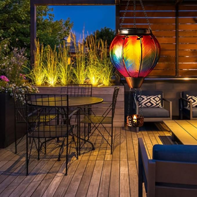 - 【Rainbow Hot Air Balloon Solar Lantern】Bring a burst of color to your outdoor space with the rainbow gradient outdoor solar lanterns. When the solar lantern is lit, they mimic a rising hot air balloon with a flickering flame, creating a beautiful effect and symbolizing warmth and good wishes.