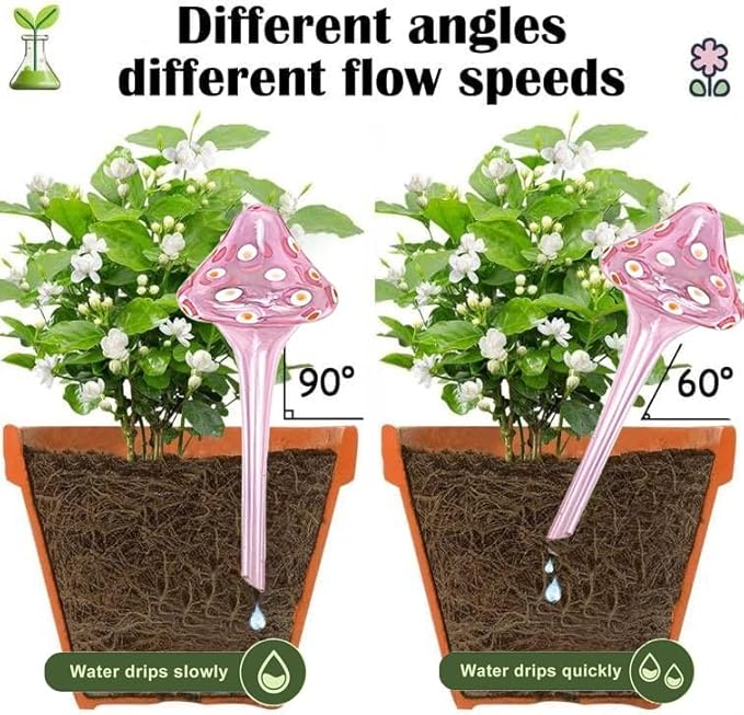 - Decorative and Functional Design: These mushroom-shaped watering globes are crafted from hand-blown glass with vibrant, unique colors. They double as eye-catching decor, perfect for indoor plants, outdoor pots, hanging baskets, and patio gardens.