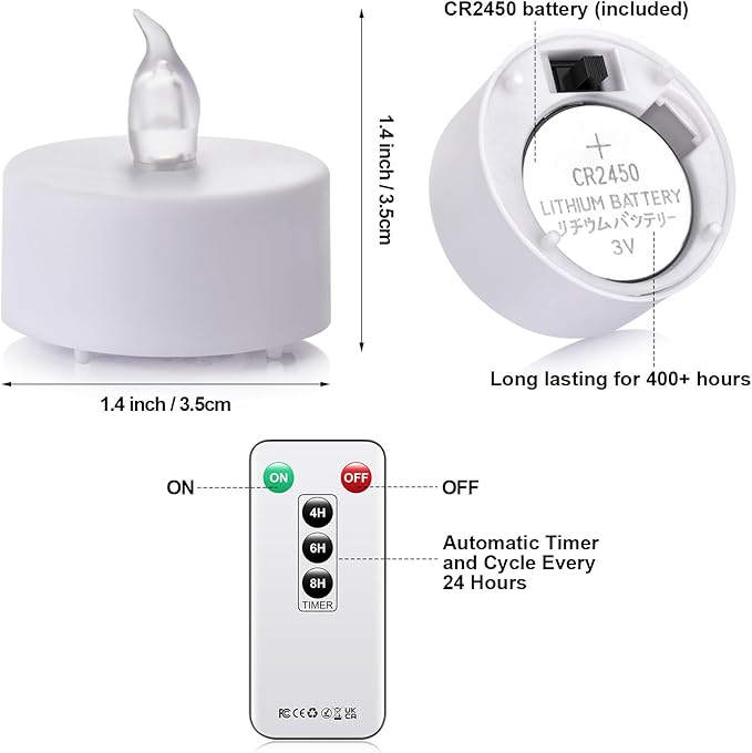 - 2.CR2450 Large capacity batteries - These remote control candles use 2450 high capacity batteries and can provide up to 400+ hours of continuous lighting, which is 15 times longer than the lighting time of traditional burning candles. This can ensure that the tea candle continues to work throughout the entire holiday period. The battery can be easily replaced at the bottom