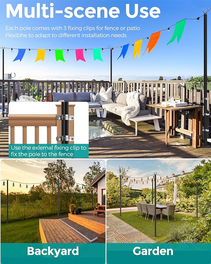 - Easy 5-Minute Assembly: Featuring a user-friendly 6-piece design, each light hanging pole comes with 3 fixing clamps. Simply connect the semi-circular head to the top pole, insert the fork into the bottom pole, and you're done! Alternatively, skip the fork and use the fixing clamps to attach the string light poles to fences. All accessories come with pre-threaded screw interfaces for quick and hassle-free assembly. It is also very quick to disassemble and store due to its own small size