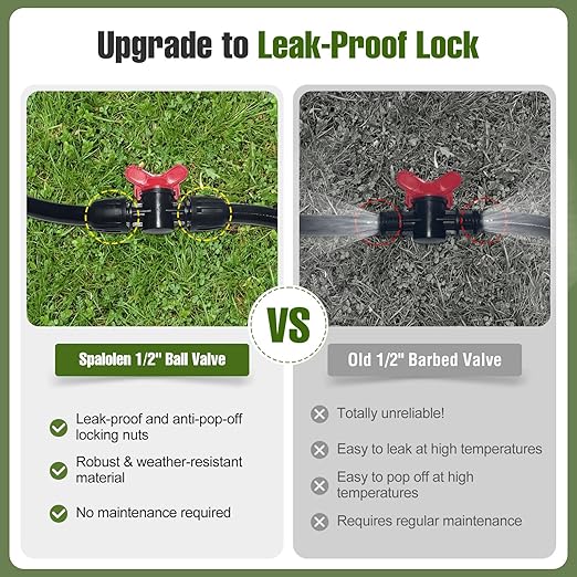 - Enhanced Locking Mechanism for Leak Prevention: Unlike 1/2" drip irrigation valve without locks, our 1/2 inch drip irrigstion fitting switch valve feature a twist-lock mechanism that prevents tubing from popping off under high water pressure. The combination of a barbed design and locking system ensures a tight, stable connection that won’t loosen over time. Enjoy a secure, leak-proof drip irrigation system without the hassle!