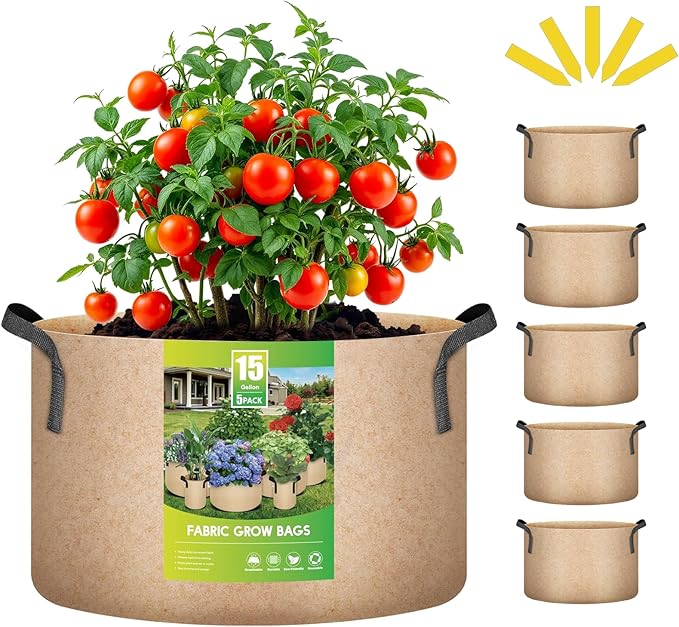 iPower 5 Pack 15 Gallon Grow Bags Heavy Duty 300G Thickened Nonwoven Fabric Plant Pots with 5 Labels & Handles for Outdoor Garden, Aeration Planter Bags for Fruits, Vegetables, Tomato & Flowers, Tan
