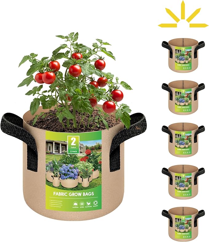 iPower 5 Pack 2 Gallon Grow Bags Heavy Duty 300G Thickened Nonwoven Fabric Plant Pots with 5 Labels & Handles for Outdoor Garden, Aeration Planter Bags for Fruits, Vegetables, Tomato & Flowers, Tan