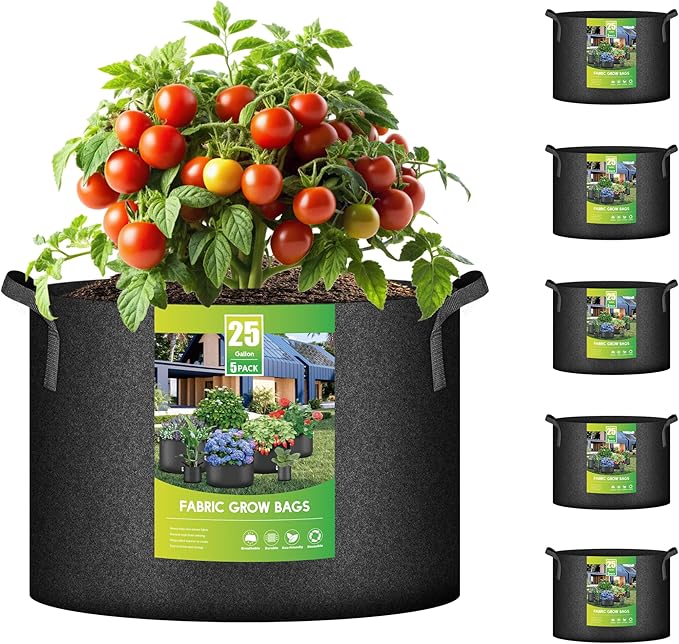 iPower 5 Pack 25 Gallon Grow Bags Heavy Duty 300G Thickened Nonwoven Fabric Plant Pots with 5 Labels & Handles for Outdoor Garden, Aeration Planter Bags for Fruits, Vegetables, Tomato & Flowers, Black