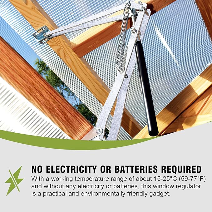 - No Batteries: Our automatic window opener is entirely self-sufficient, requiring no batteries or electricity. This energy-efficient design saves you money while reducing your environmental footprint—perfect for sustainable gardening.