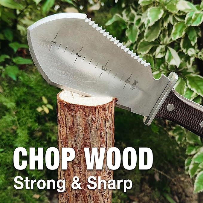 - Efficient & Versatile: Ideal for fast digging, weeding, and cutting. Serrated edge cuts ropes, woven bags, and plant roots, while sharp edge cuts through small branches.