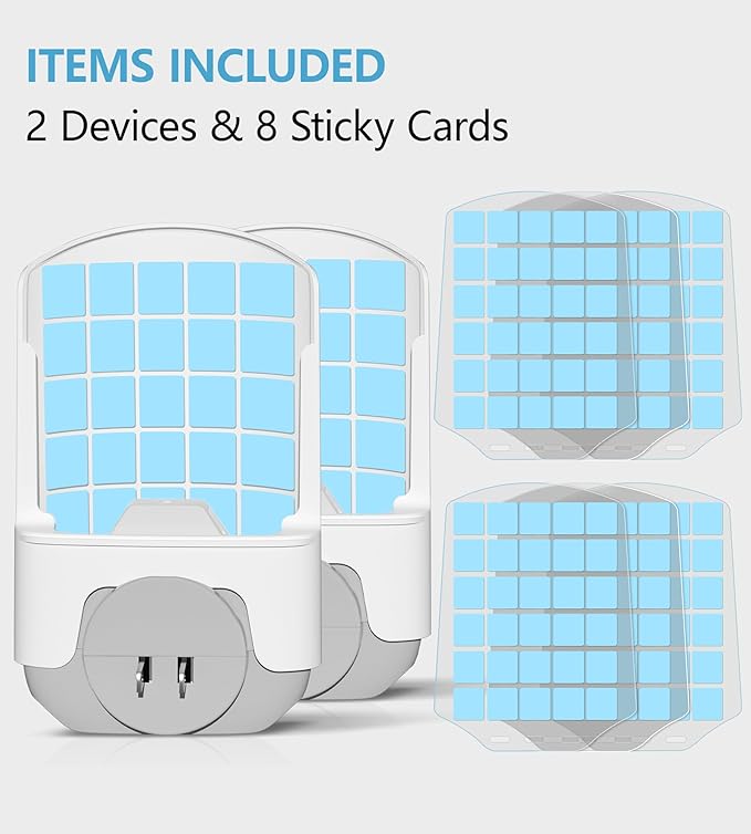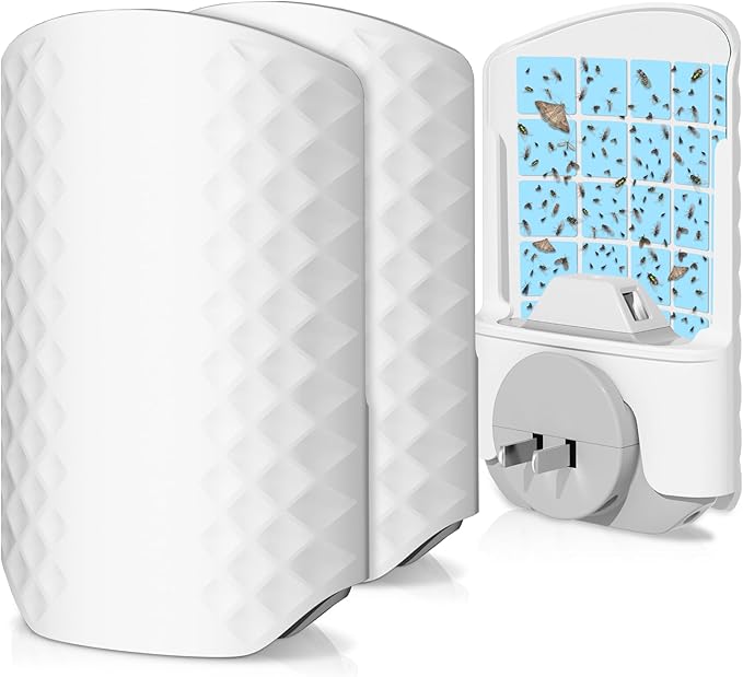 - Upgraded Materials: Crafted from durable, fire-retardant ABS material, this flying insect trap ensures long-lasting safe use. The plug-in housing is lightproof, directing light onto the device and surrounding walls to better attract insects. The sticky card features blue grid patterns to enhance attraction and maximize effectiveness, making it a perfect indoor fruit fly trap for pest control