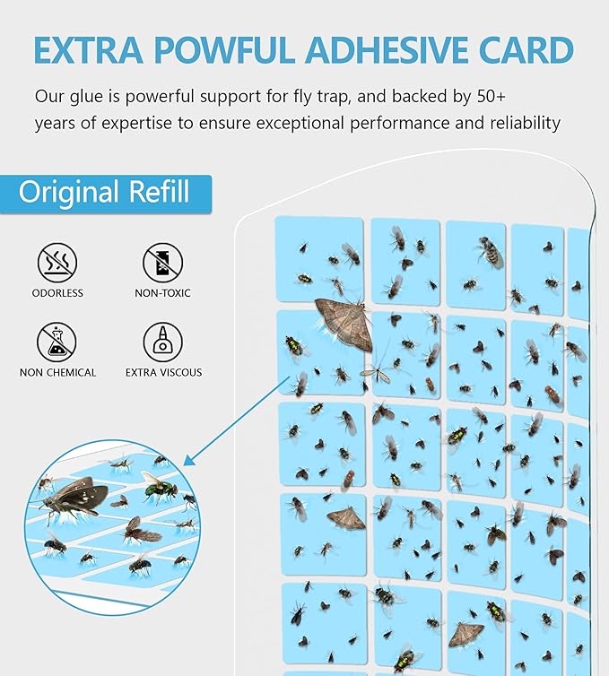 - Design Highlights: Designed as a fly trap, fruit fly trap, mosquito trap, and gnat trap, this device effectively attracts flying insects by using UV light, securely trapping pests on the sticky card. The device consists of 2 parts: a plug-in housing and a base, making it easy to replace the refill card or turn the device off. It's convenient, safe, and user-friendly. Our glue is powerful support for fly trap, and backed by 50+ years of expertise to ensure exceptional performance and reliability