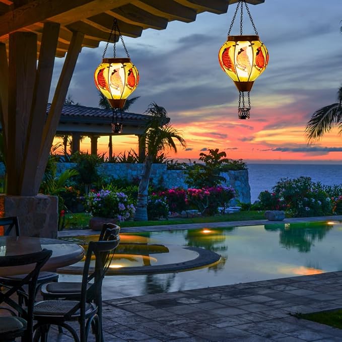 - 【Cardinal Hot Air Balloon Solar Lantern】These outdoor hanging solar lanterns alternates between blue and green glass, adorned with red cardinals, creating a captivating display. When the solar lantern is lit, they mimic a rising hot air balloon with a flickering flame, creating a beautiful effect and symbolizing warmth and good wishes.