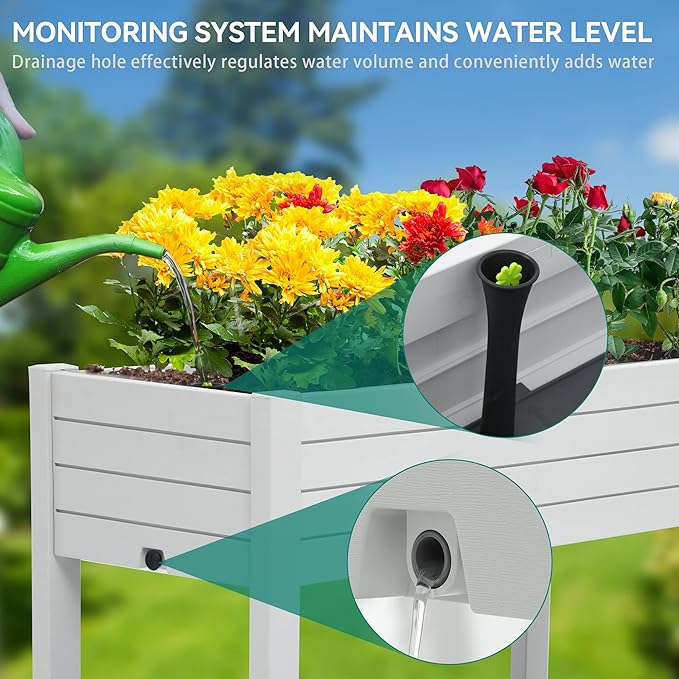 - Effortless Water Management: Our elevated garden bed features a central divider for effective soil separation and a float system for precise water level monitoring; Side drainage holes ensure optimal moisture control