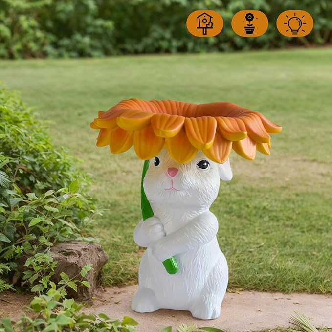 - 【Solar Garden Decor】This rabbit garden statue is made of resin and features a charming rabbit holding a sunflower umbrella. The sunflower has a light in the center that charges automatically during the day using solar energy. At night, the light turns on automatically, adding a warm ambiance to your garden. The statue is not only decorative but also functional as an outdoor bird feeder by placing birdseed on the sunflower.