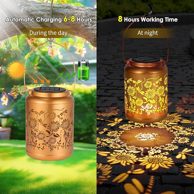 - Durable & IP65 Waterproof: Outside solar lantern is made of premium and strudy metal. IP65 waterproof rating design, don't worry about rain, solar garden lights can work on rainy days. Solar power supply, no electricity charge, no power cord required, easy to use