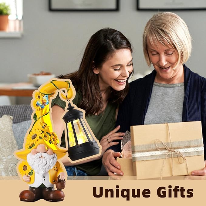 Solar Garden Decor - Sunflower Gnome Statue with Lantern 9.1" Garden Gnomes Outdoor Funny Solar Statues Yard Porch Lawn Patio Decor Gardening Gift for Women Mom Grandma Wife Girlfriend